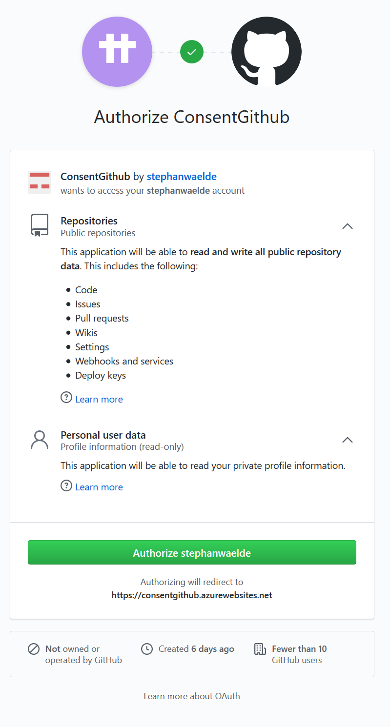This web app was written as an exercise to understand the OAuth2 authorization code grant flow with Github identities. It is based on the sample code from Aaron Parecki at https://github.com/aaronpk/sample-oauth2-client. The code from this web app can be found at https://github.com/stephanwaelde/consentgithub.
